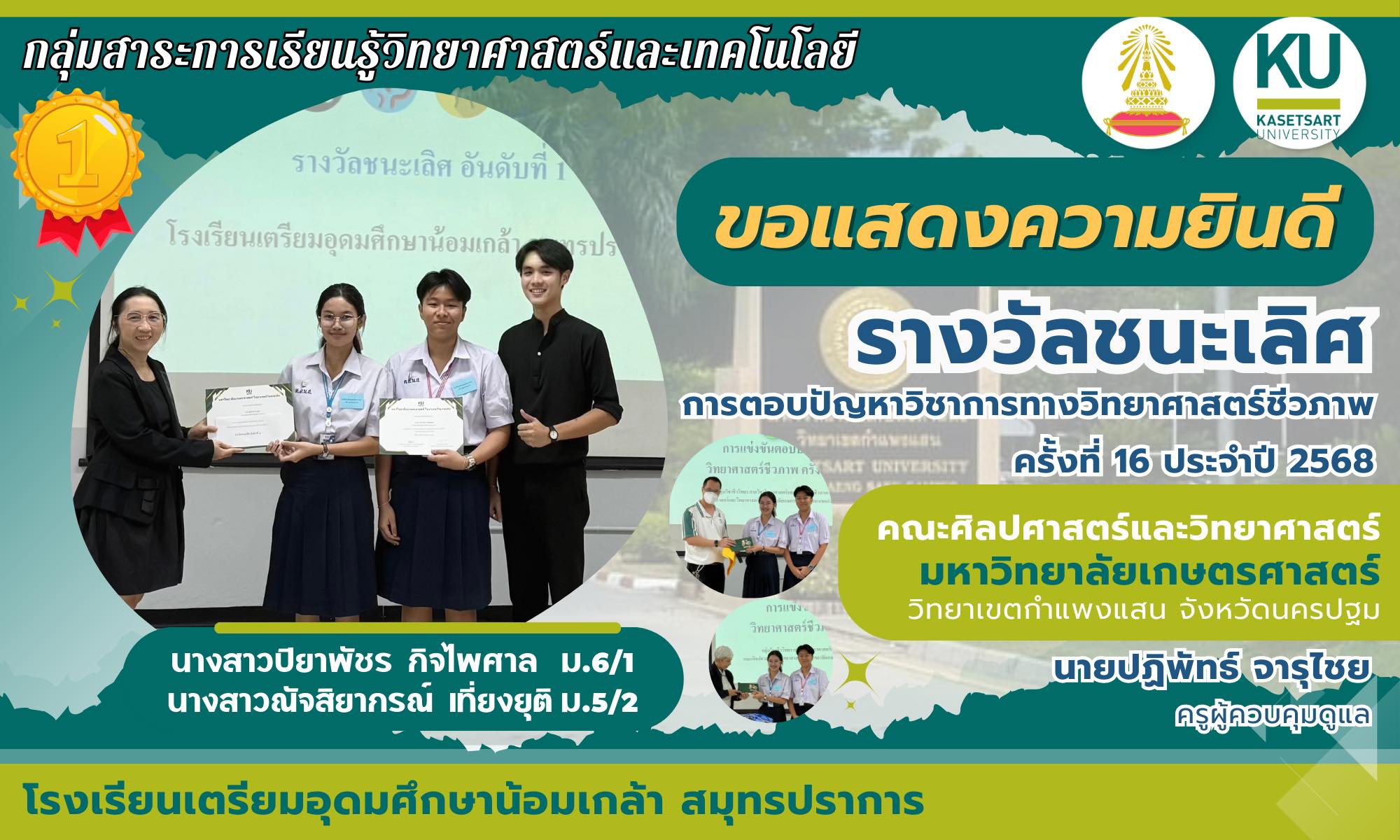 ขอแสดงความยินดีกับนักเรียนที่ได้รับรางวัลชนะเลิศและรางวัลทักษะปฏิบัติการทางชีววิทยายอดเยี่ยม ในการแข่งขันตอบปัญหาวิชาการทางวิทยาศาสตร์ชีวภาพ ครั้งที่ 16