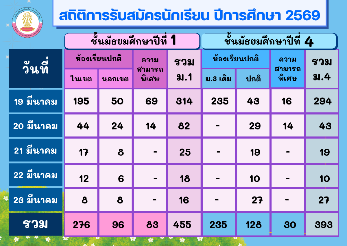 ประกาศรายชื่อนักเรียนผู้มีสิทธิ์มอบตัวเพื่อเข้าศึกษาต่อระดับชั้นมัธยมศึกษาปีที่ 1 และ 4 ประเภทห้องเรียนพิเศษ ปีการศึกษา 2569 (รอบเพิ่มเติม) 15 มี.ค. 69